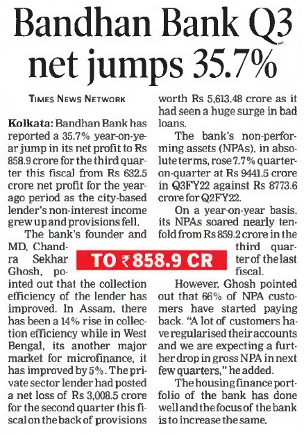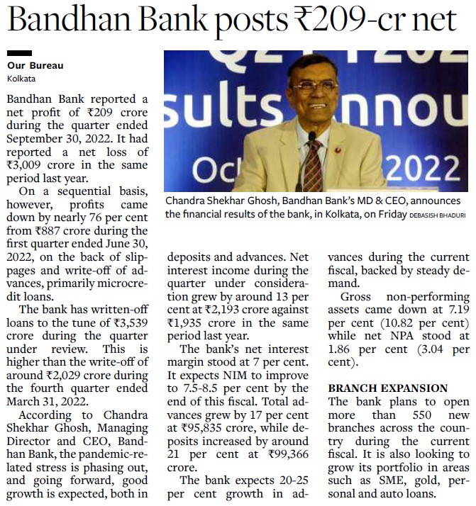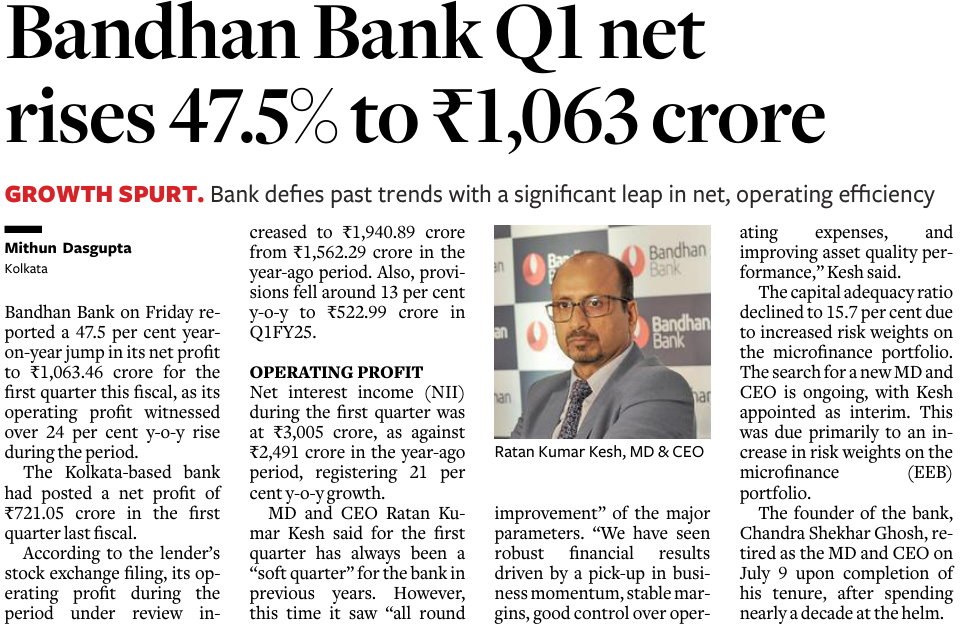 Bandhan Bank’s net profit jumps 47% to ₹1,063 cr