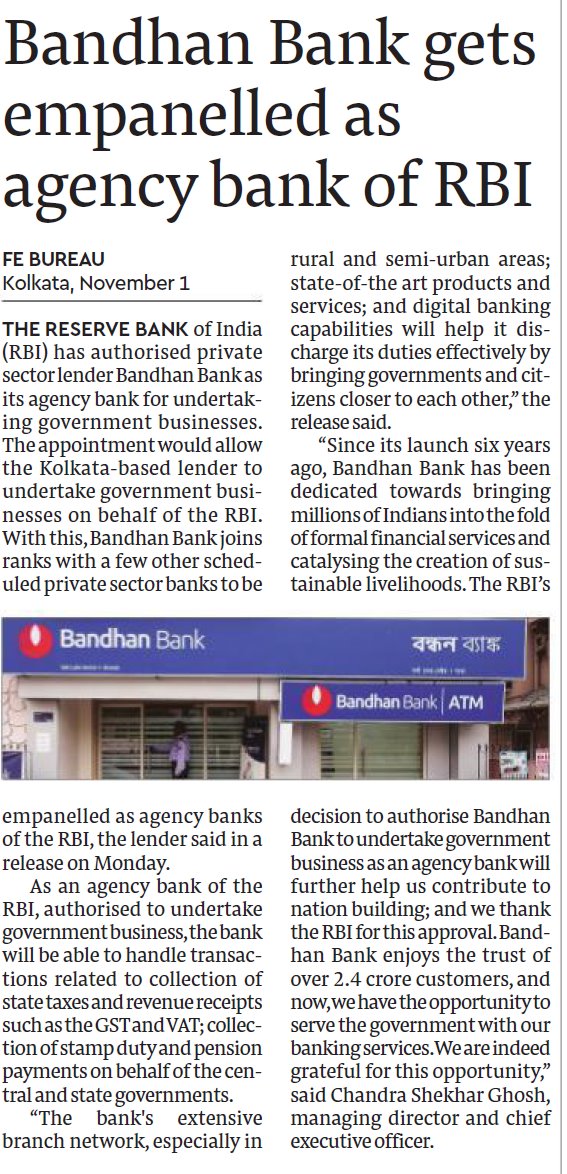 Bandhan Bank gets empanelled as agency bank of RBI