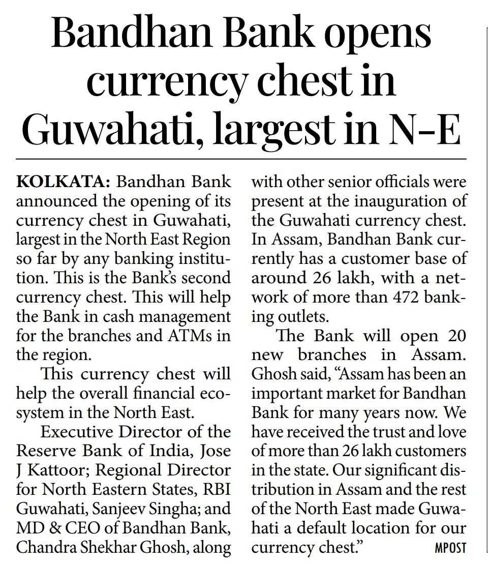 Bandhan Bank opens currency chest in Guwahati, largest in N-E
