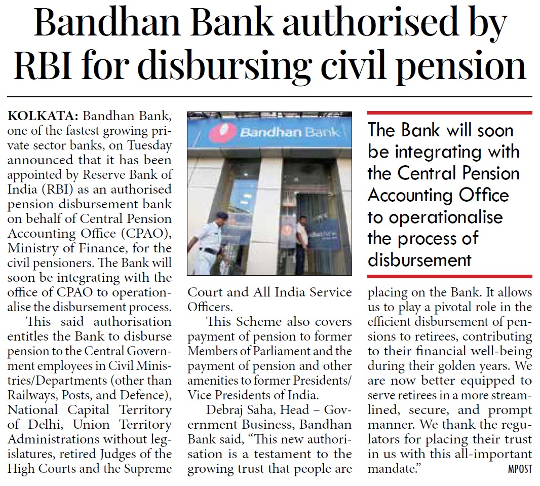 Bandhan Bank ties up with Govt. of India to set up Sparsh service centres for Defence pensioners