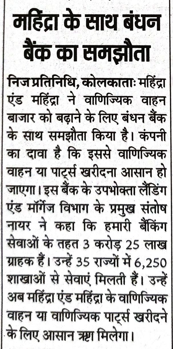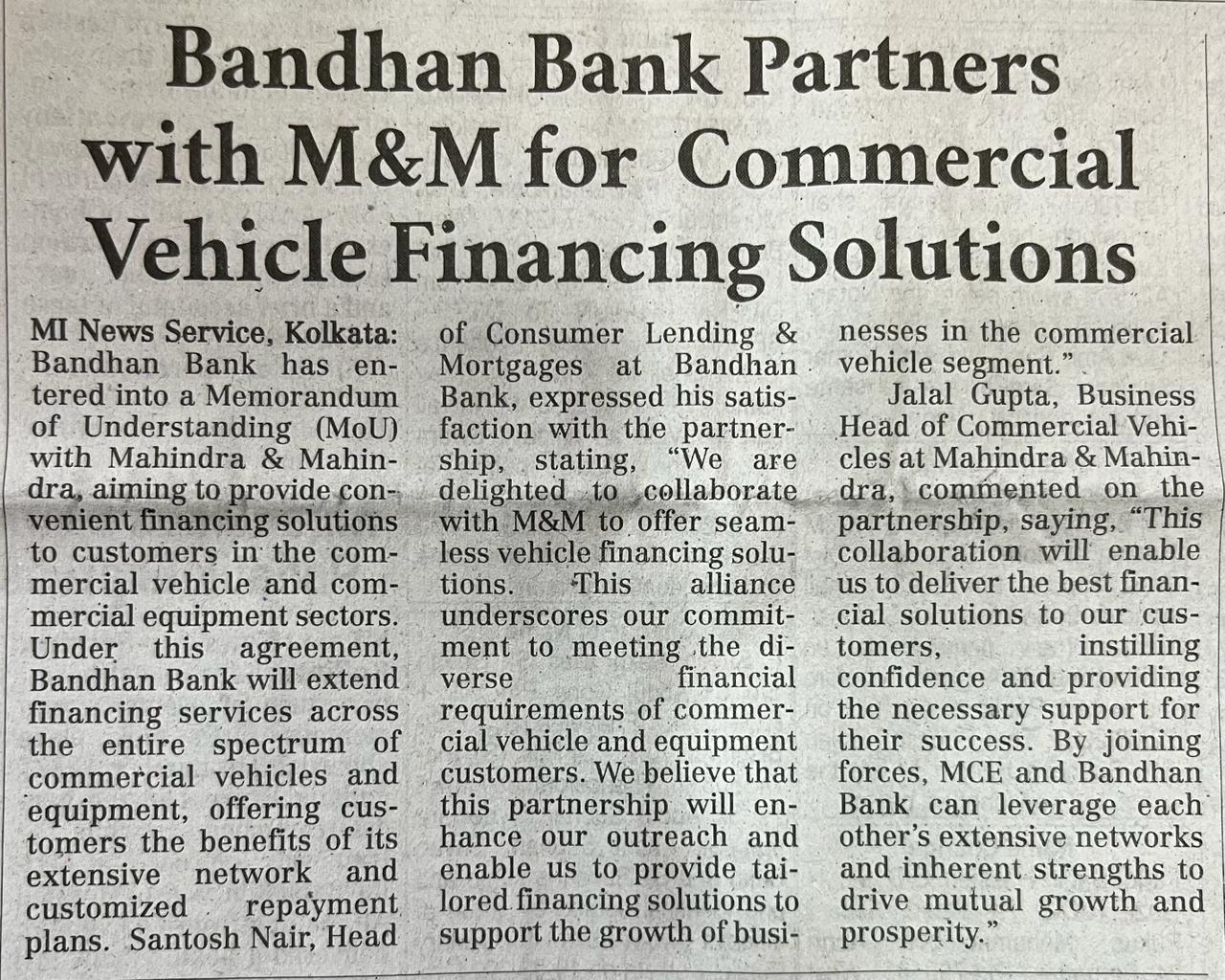 Read moreBandhan Bank and M&M sign MoU to offer attractive commercial vehicle and equipment financing solutions