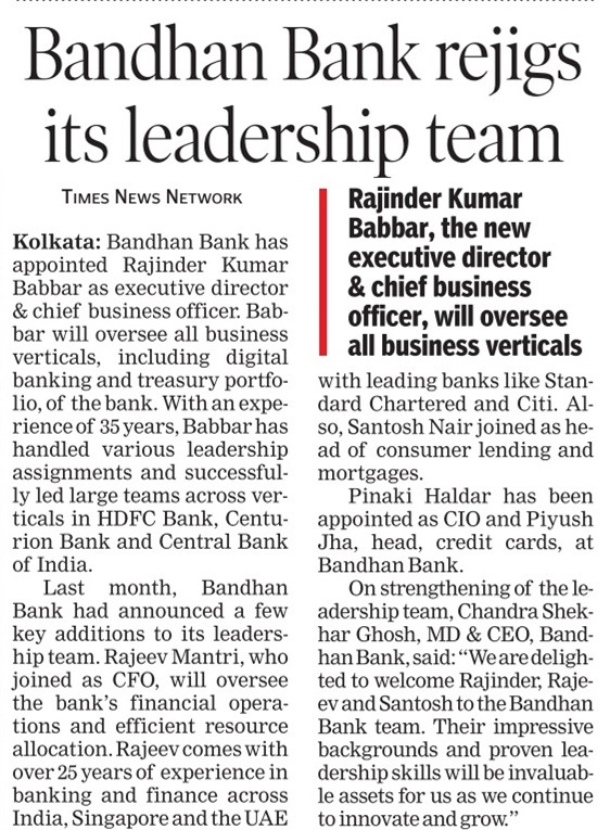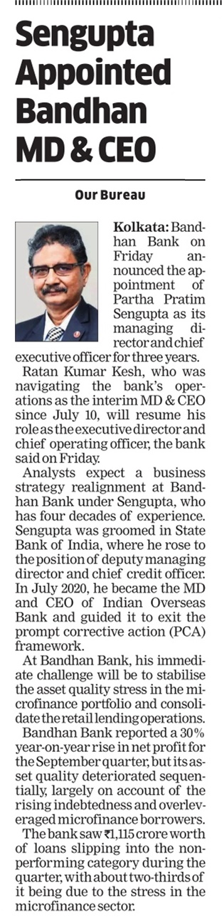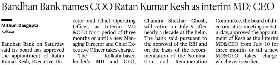 Bandhan Bank appoints Ratan Kumar Kesh as interim MD&CEO for 3 months