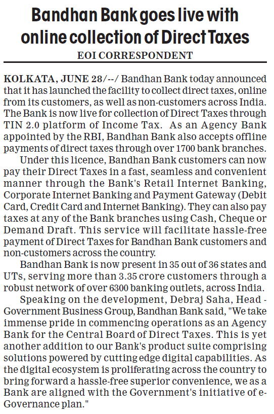 Bandhan Bank commences online collection of direct taxes