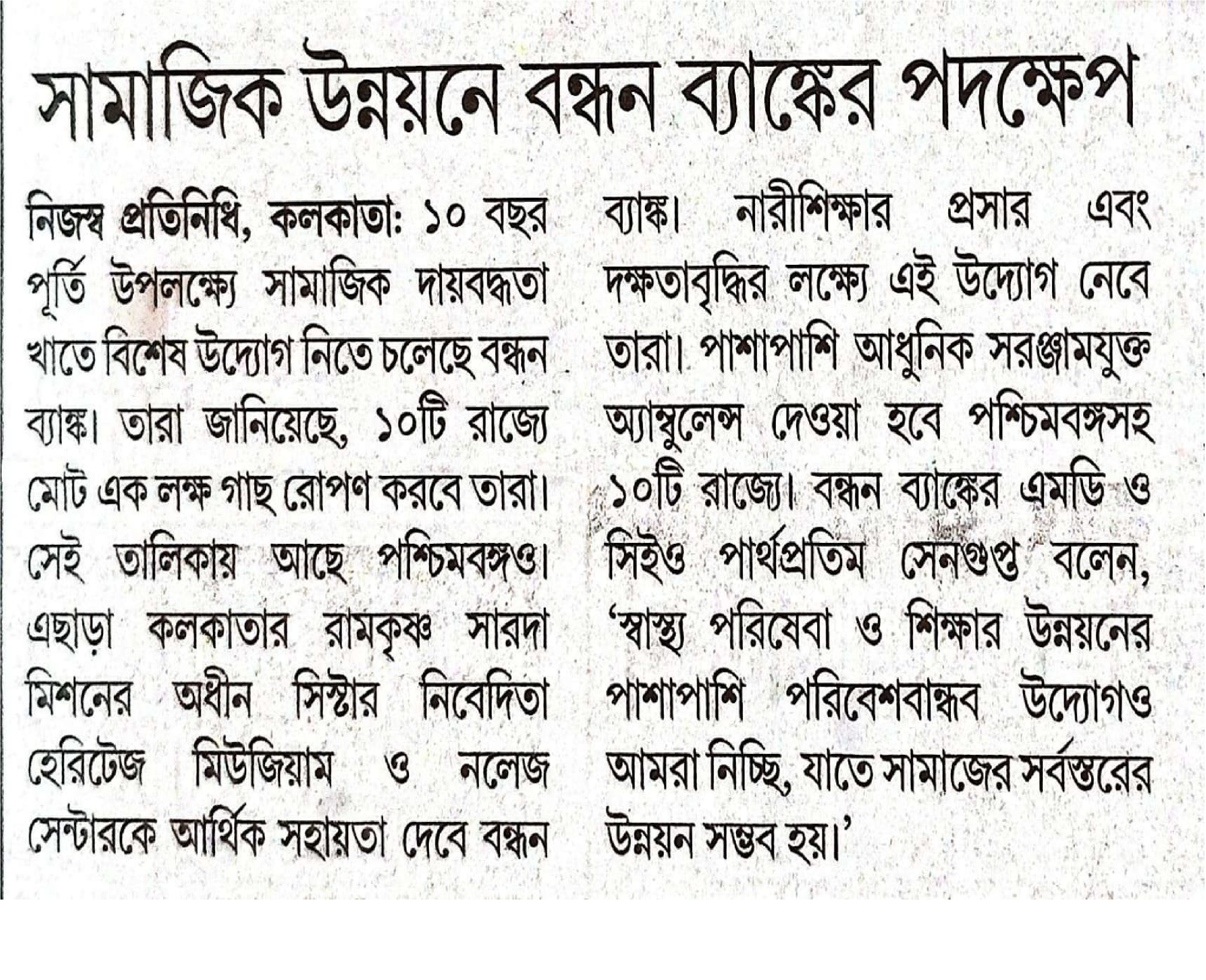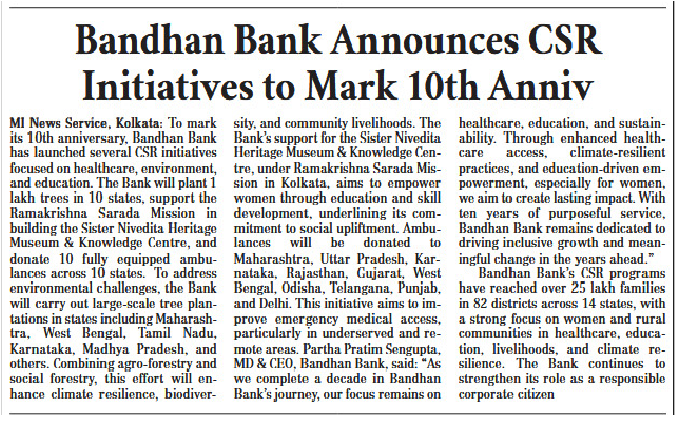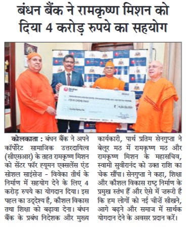 Bandhan Bank contributes Rs 4 crore under CSR initiative for Ramakrishna Mission Centre construction