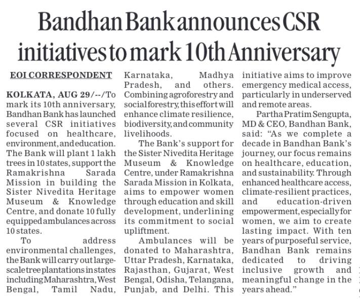 Bandhan Bank to plant 1 lakh trees, donate 10 ambulances