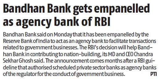 Bandhan Bank gets empanelled as agency bank of RBI