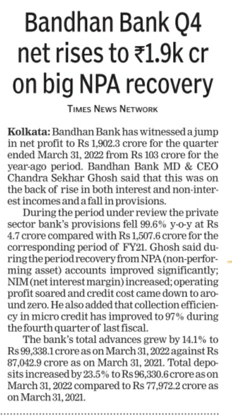 Read moreBandhan Bank FY20 net profit grown 54.96%(YoY)at Rs.3,024 crore after taking COVID 19 provision on standard advances