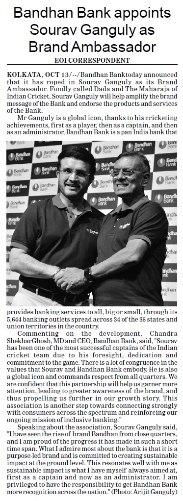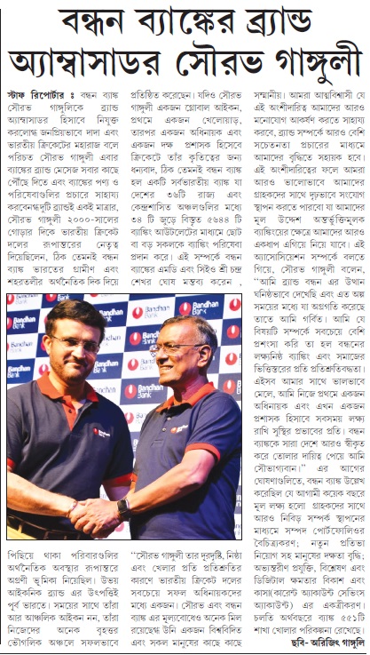 Bandhan Bank appoints Sourav Ganguly as Brand Ambassador