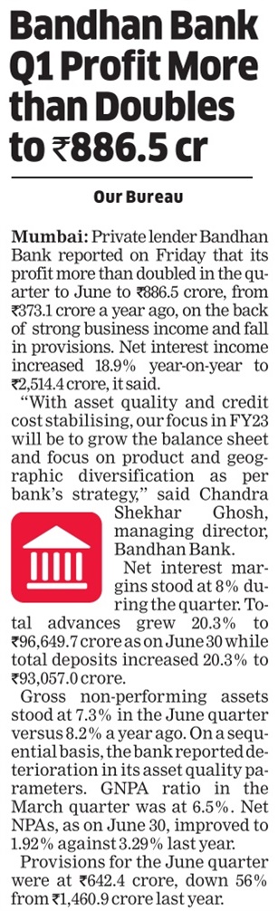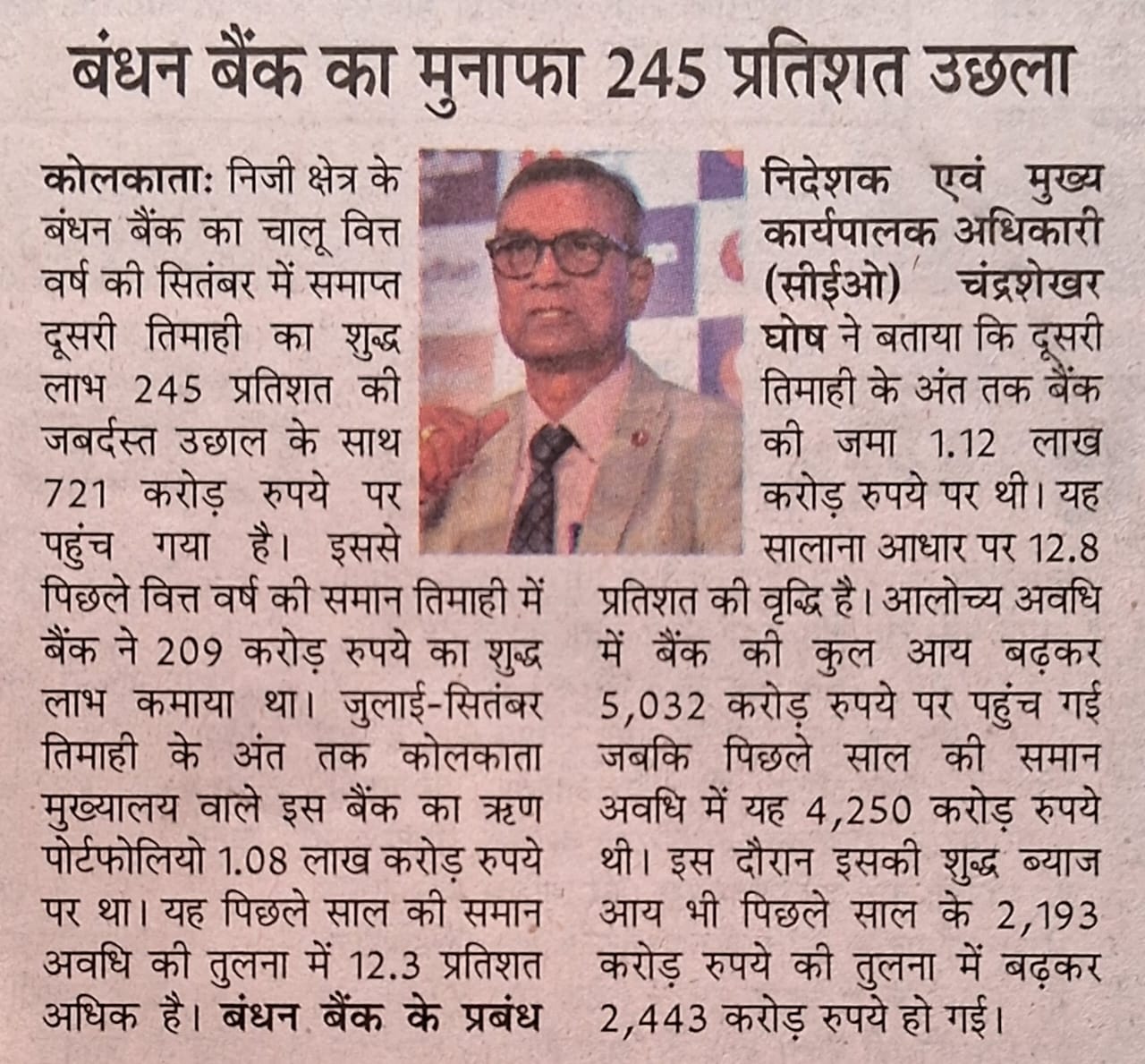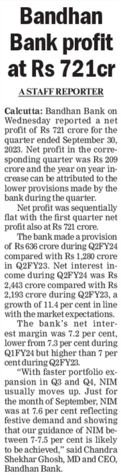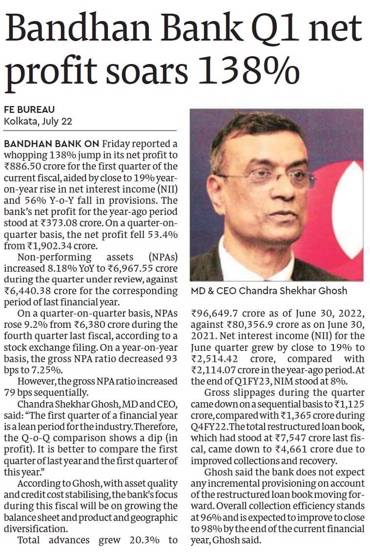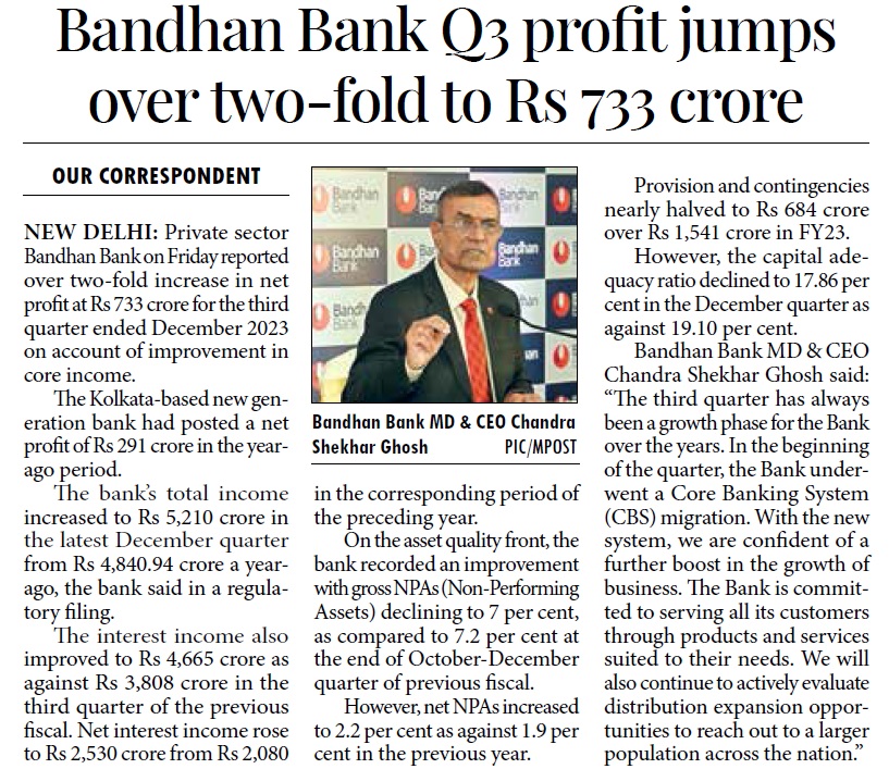 Bandhan Bank’s net profit jumps 47% to ₹1,063 cr