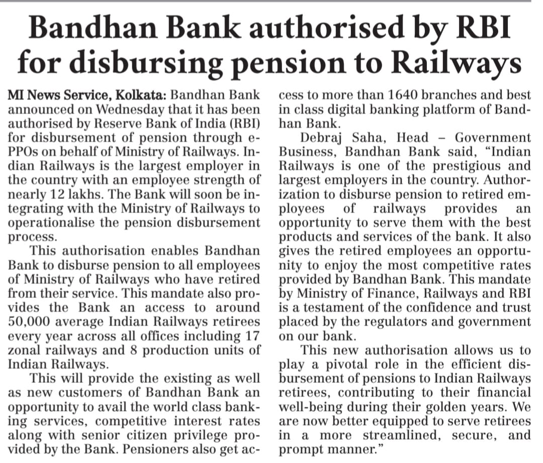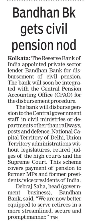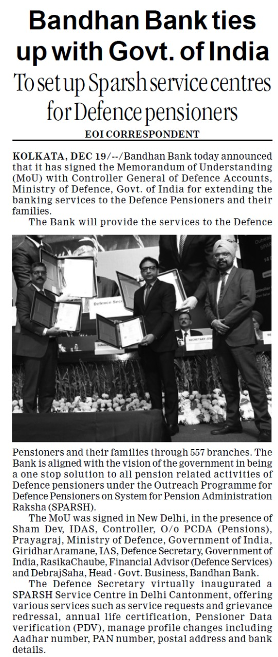 Bandhan Bank ties up with Govt. of India to set up Sparsh service centres for Defence pensioners