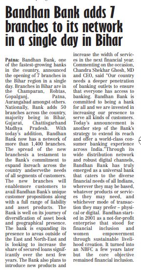 Bandhan Bank adds 7 branches to its network in a single day in Bihar