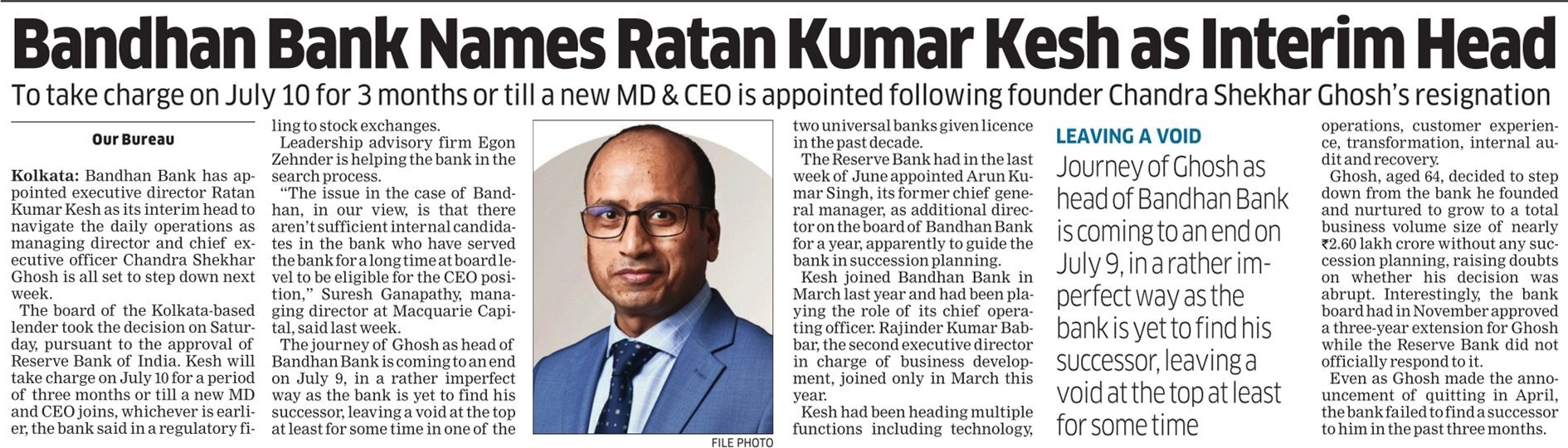 Bandhan Bank appoints Ratan Kumar Kesh as interim MD&CEO for 3 months