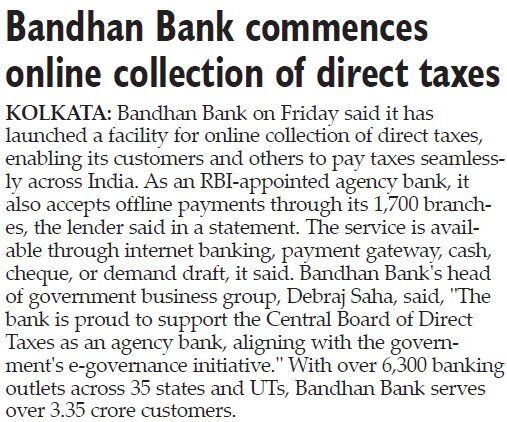Bandhan Bank commences online collection of direct taxes