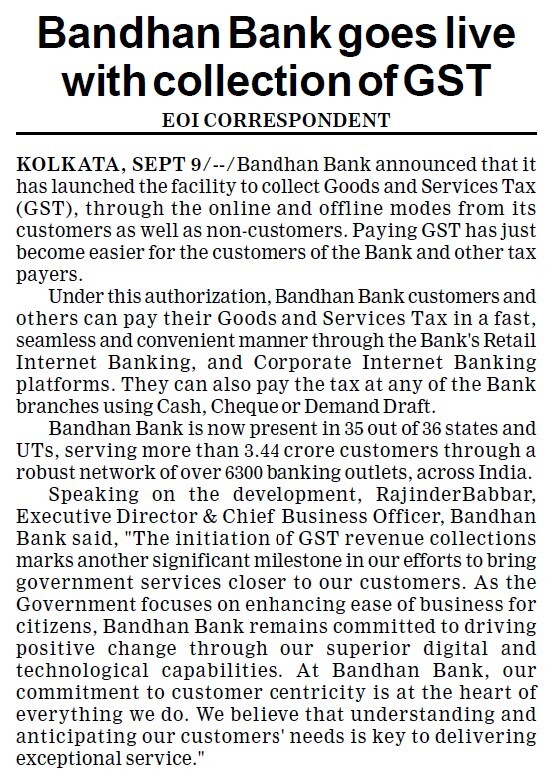 Bandhan Bank launches facility to collect GST through online, offline modes