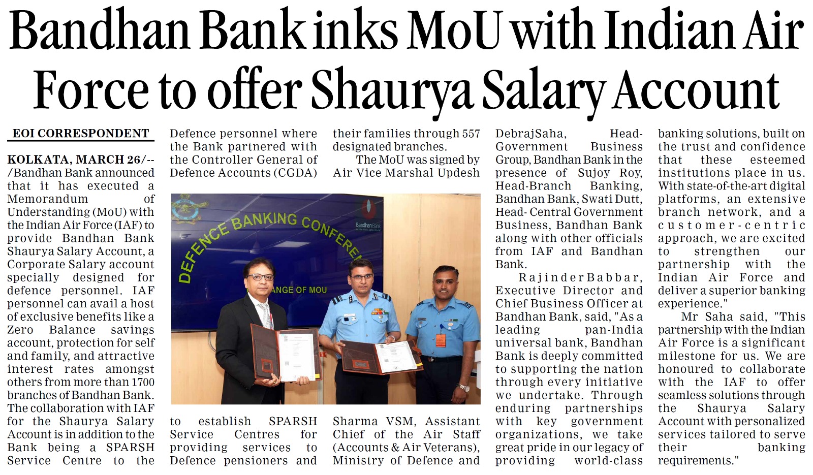 Bandhan Bank signs MoU with Indian Air Force to provide corporate salary account