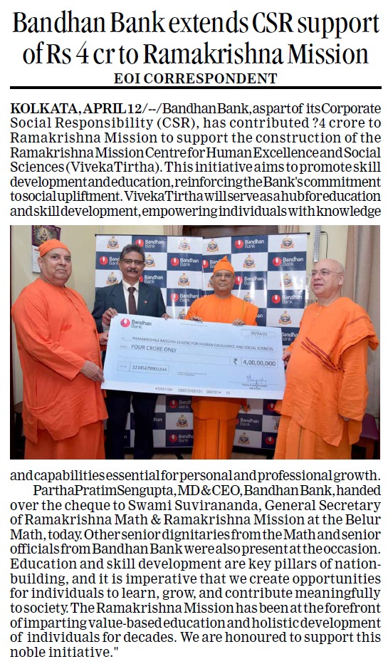 Bandhan Bank contributes Rs 4 crore under CSR initiative for Ramakrishna Mission Centre construction
